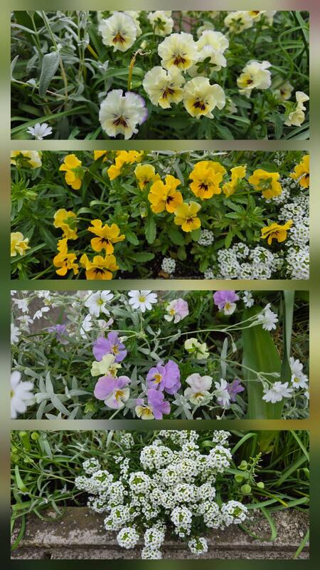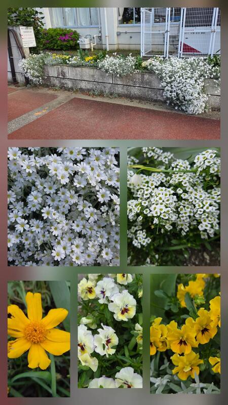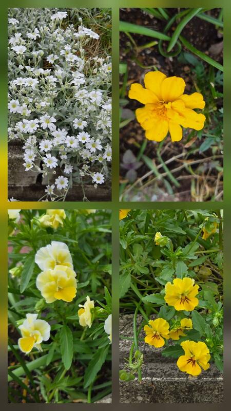 ◆玄関側の花壇では、セラスチウムが満開です。アリッサム、ビオラ、マリーゴールドが咲いています。