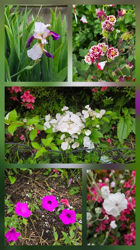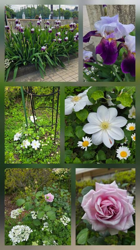 ◆その他の花壇では、ジャーマンアイリス、クレマチス、平和のバラICANが咲き始め、とても綺麗です。