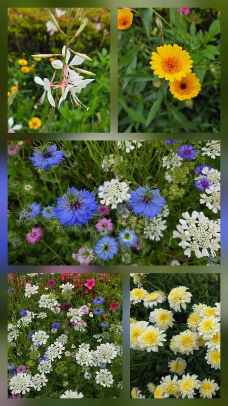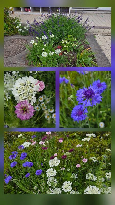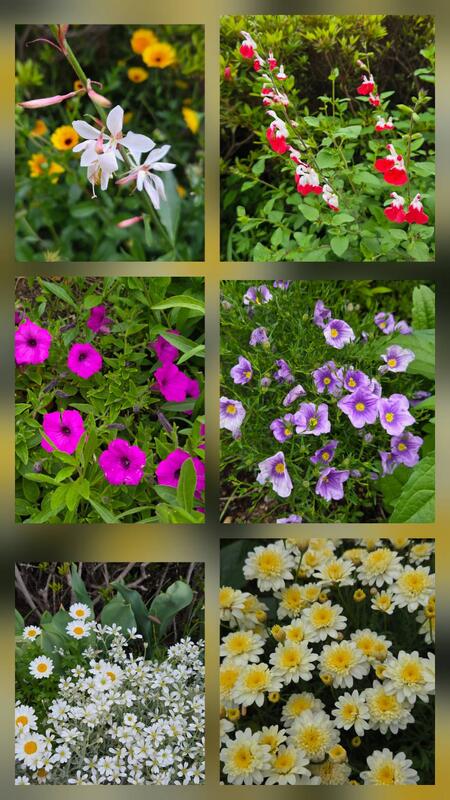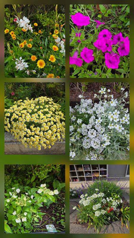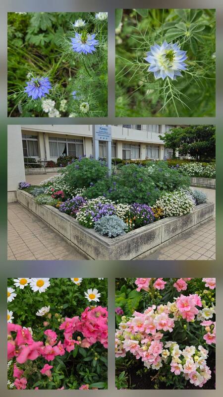 ガウラ、チェリーセージ、ペチュニア、ニーレンベルギアオーガスタ、セラスチウム、ノースポール、ボンザマーガレット、オルレア、アジサイ、サルビアコクシネア、ニゲラ、ヤグルマギク、キララ、オダマキ、イベリススノーボール、カレンジュラまどかが、咲いています。
