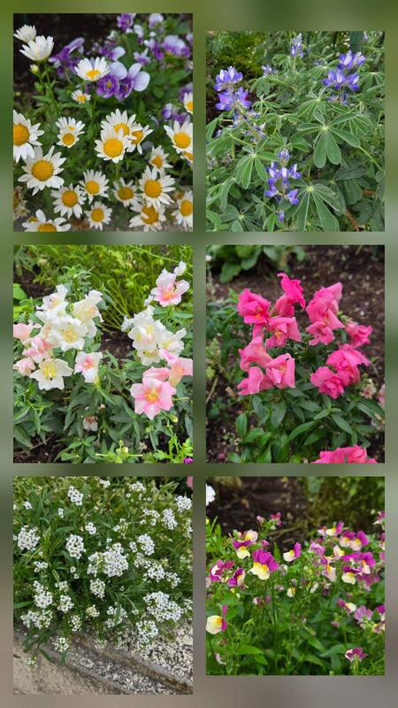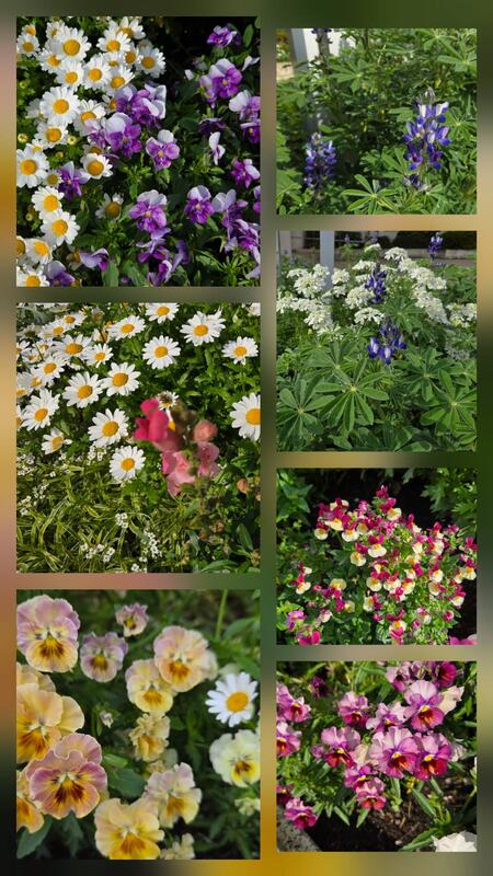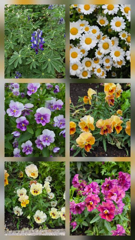 ◆メインの花壇では、ビオラ、ノースポール、ルピナス、キンギョソウ、アリッサム、ネメシアが咲いています。