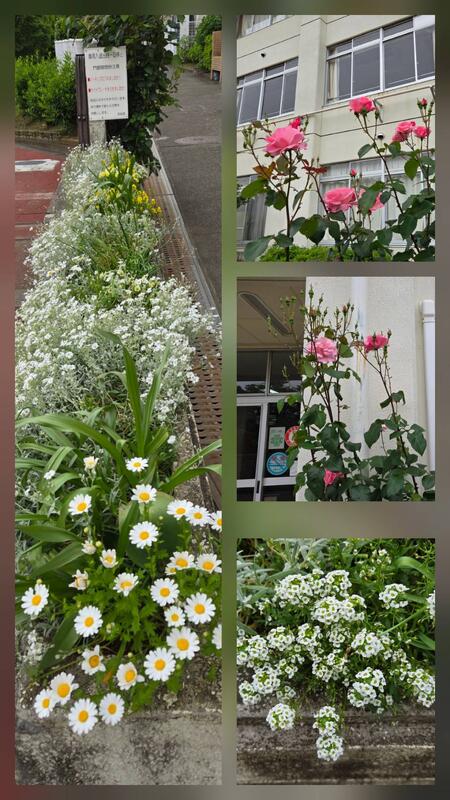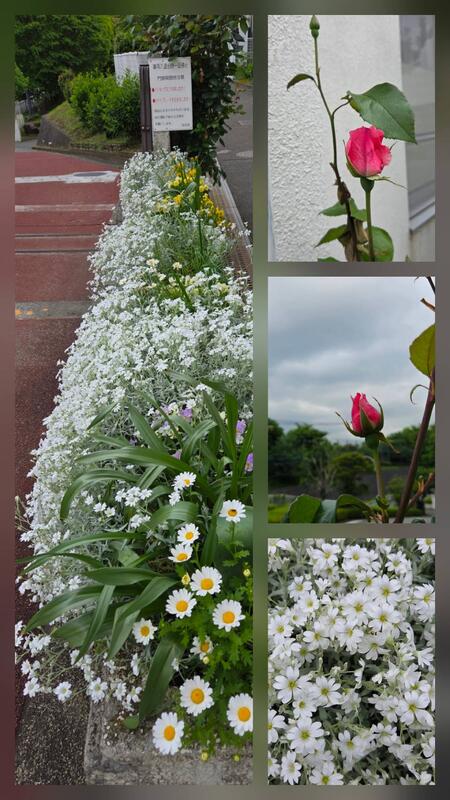 ◆玄関側の花壇では、バラがとても綺麗に咲いています。アリッサム、セラスチウム、マリーゴールド、ビオラが咲いています。