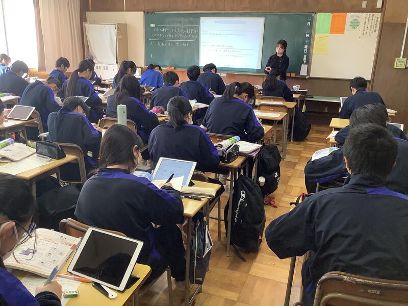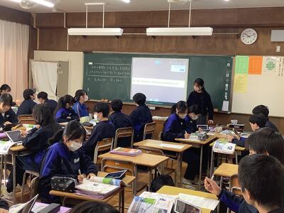 2年生の理科の時間に研究授業を実施しました。日本の冬と夏に着目して、季節風の風向の違いについて、班ごとに仮説を立て、データを用いて特色を探りました。授業後は、市内の先生や教育委員会の先生と協議会を行いました。
