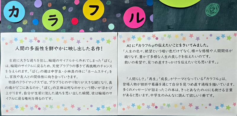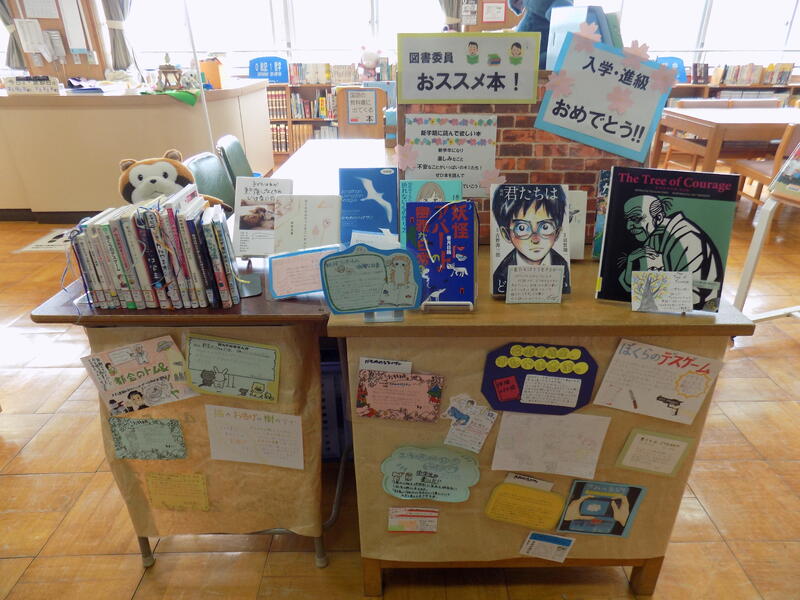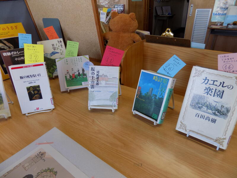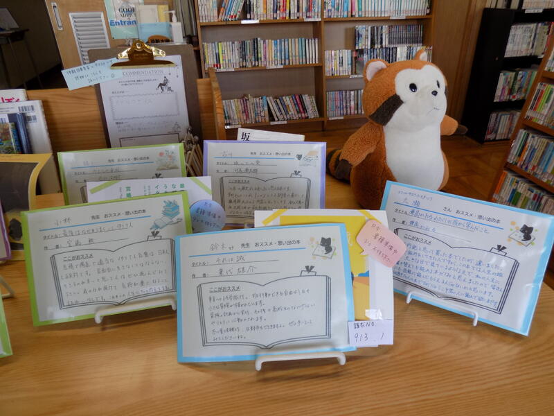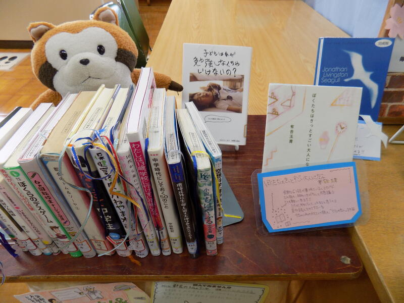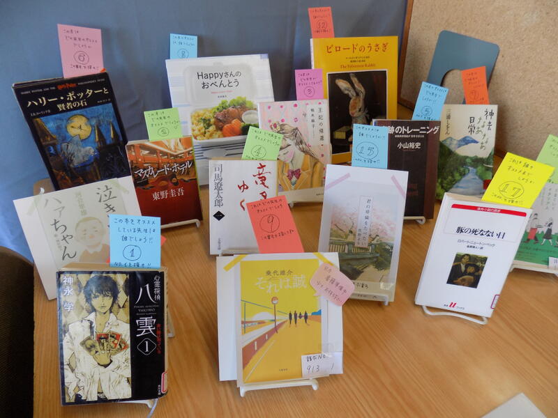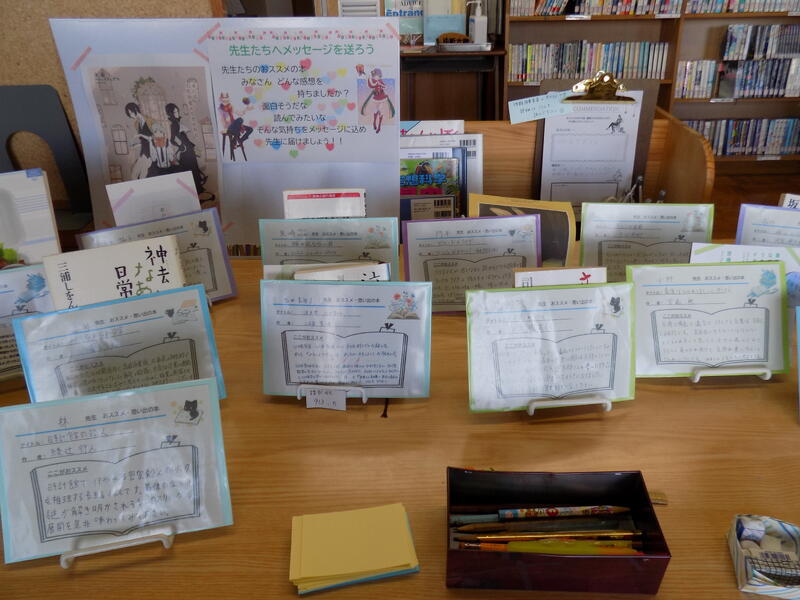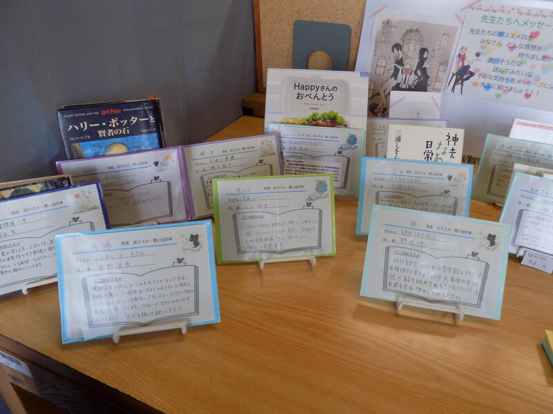 読書週間の時に先生方から「オススメの本」を紹介していただきましたが、メッセージカード付きで展示しています。