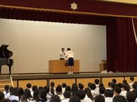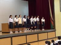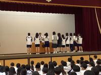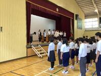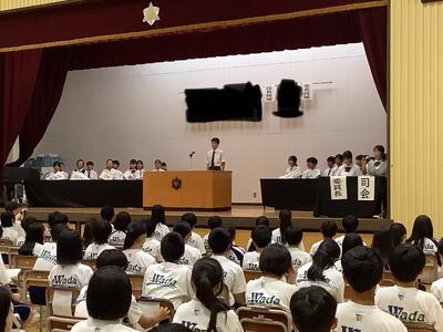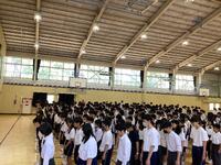 校歌リーダーズ、みんなの力で最高の校歌が聞けて、気持ちよく夏休みに入れます。表彰は、熱中症対策標語コンテストと水泳部の都大会1位と全国大会出場を行い、生徒会からは「謎解きスタンプラリー」の表彰しました。生活指導主任からは、交通安全、水難事故、闇バイトから身を守る話をしました。みんなよく聞いていました。