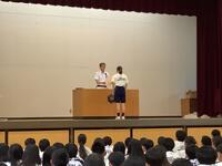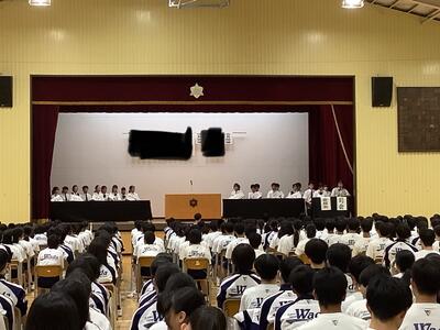 生徒会役員へ立候補した生徒の自己紹介の後、水泳の全国4位、ジュニアオリンピックの3位、吹奏楽コンクールの銀賞、空手の全国5位、バレーボール部の市内5位と個人賞の表彰を行いました。夏の活躍を祝い、そしてこれからの活動の応援もしていきます。