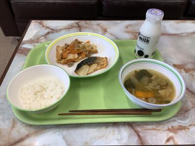 さばの塩焼き、生揚げとキャベツの炒め物、野菜の生姜汁、ご飯、牛乳です。