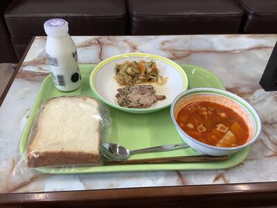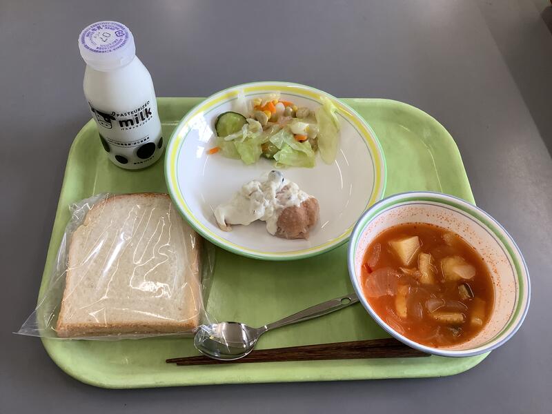鶏肉のハーブ焼き、ツナ入りキャベツソテー、ミネストローネ、コーンパン、牛乳です。