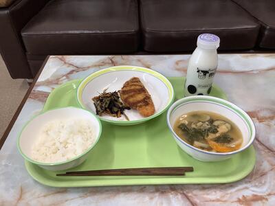 さけフライ、ひじきの煮物、野菜のごま汁、ご飯、牛乳です。