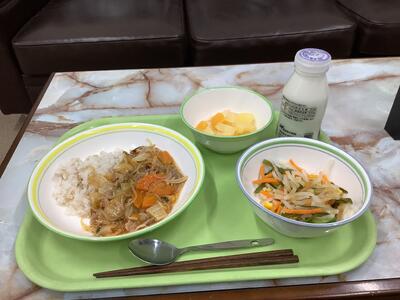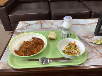 ハヤシライス、じゃこ入り野菜ソテー、りんご、牛乳です。