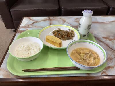 ごぼうのしぐれ煮、厚焼玉子、薩摩汁、ご飯、牛乳です。