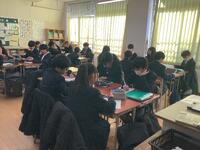 今冬1番の冷え込みと聞きましたが、朝の日差しのおかげて、それほどの寒さを感じず登校できたようです。学級閉鎖明けで全クラスが集まりました。