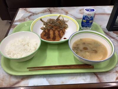 ぶりのフライ、ごぼうのしぐれ煮、なめこの味噌汁、ご飯、ジョアです。