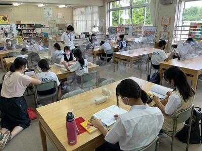 6月からスタートした「STUDY+」(図書室にて、月・火・木・金曜日15:30~17:00)は、教職を目指す大学生や地域のボランティアの方が生徒をサポートしながら、自学自習のスタイルで行っています。この2日間は、多くの生徒が来室していました。
