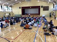 今週から音楽発表会に向けた合唱の特別練習が始まっています。この日は、練習の一環として、3年生の練習の様子を同クラスの1、2年生が見学するという「縦割り練習」が体育館でありました。