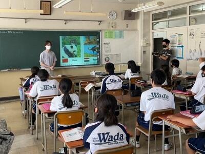 英語の学習では、生徒の英語発音や国際理解教育の向上を目的として、定期的にALT(外国語指導助手)が派遣されています。1年の英語では、ALTのグラム先生が、ゲーム性を取り入れながら、自然に英語を使えるような楽しい授業となっていました。