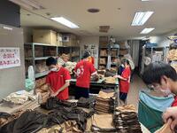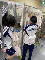 竹取の湯です。今日は服をたたむ日。お互いに声をかけ合ったりしながら、コツを覚えて一生懸命取り組んでいます。明日は生徒たち念願の、浴場での仕事をさせてもらえるそうです。