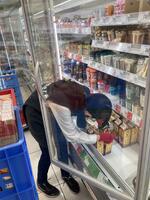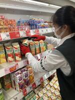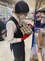 SEIYU永山店です。品出しを丁寧にしています。お客様への挨拶や対応も頑張っていました。制服が似合ってますね!