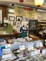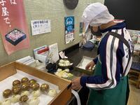 高幡まんじゅう松盛堂です。元気な声で朝礼の司会をして、店舗に分かれての体験が始まりました。まんじゅう一つ一つにシールを貼り、箱詰めをしたりしています。