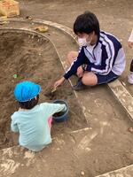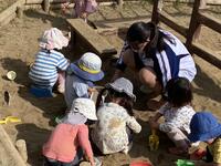 お山のある園庭で走ったり、砂場遊びをしたり、さまざまな年齢のこどもたちとふれあっています。