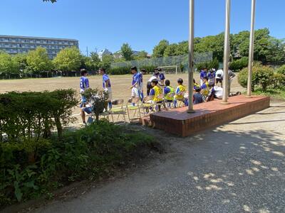 サッカー部の応援に聖ヶ丘中は来ています。合同チームなので協力して勝利に向かってほしいです。