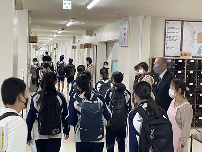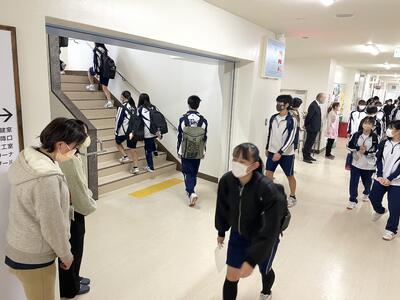 オリエンテーション後、本校の生徒会本部役員等が引率して、中学校での授業が行われる教室に案内しました。各教科の授業では、学習の面白さや不思議さ、また新しい発見もありました。さらに、「楽しかった」との感想もあり、先生の話を聞き逃さないように耳を傾ける様子がたくさんありました。