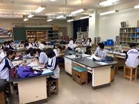 本校では、自由に自主学習ができる「STUDY+(スタディ・プラス)」が定期的に行われています。この日は、「STUDY+」が行われている図書室や第1理科室には、延べ50人以上の生徒が学習ワークなどを持ち寄り学習していました。また、この活動には、地域の方や大学生が生徒の学習をサポートしてくれています。