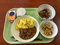 メニューは、ナスや枝豆が入った夏野菜のキーマカレーに、のり塩ポテト、パリパリサラダとオレンジジュース、そしてデザートは冷たい梨シャーベットというものでした。