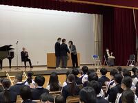 この日の6時間目、昨年度までお世話になった先生や職員の方々に感謝の気持ちを表す「離任式」を体育館で行いました。