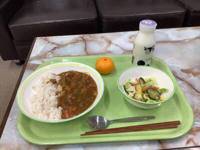 ポークカレーライス、キャベツとコーンのサラダ、みかん、牛乳です。