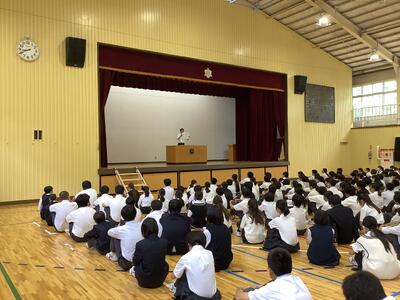 生徒会長は大谷翔平選手の話題を使って、先入観をもたず、挑戦してほしい。残りの7日間も1日1日を大切に後悔を残さないと語りました。保健委員会は水分不足による体調不良が増えている。水筒持参と登校時の帽子の活用を呼びかけました。3年学級委員会はベルマークの取り組みについて説明して、3年の取り組みから全校へ普及する計画を伝えました。そして生徒会本部からあいさつ運動の紹介。あいさつの見本を見せてくれました。みんなであいさつの練習もしました。その後、女子バスケットボール部の準優勝の表彰をしました。最後に、生活指導主任からは、例えば体育の着替えで走らないなど具体的な例を出して、残りの2週間落ち着いて行動をして、一学期を無事に終えてほしいことを伝えました。