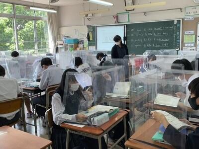 本校では、全学年全授業の英語学習を2つの学級を3分割にする少人数授業で実施しています。3年生では、26人程度での授業となり、生徒同士や生徒と先生とのコミュニケーションが活発に行われます。下の写真は、ペアーワークの様子ですが、感染症対策として、生徒一人一人がパーティションを利用しています。