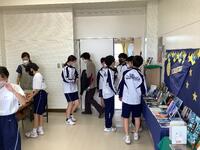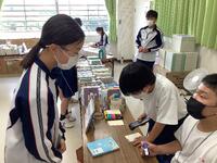 臨時図書室は、4階多目的室準備室のため、少し狭いのですが、本のレイアウトも工夫されて、オープン初日は大盛況でした。特に、2階から4階となったため、臨時図書室が近くになった1年生の利用が多かったようです。