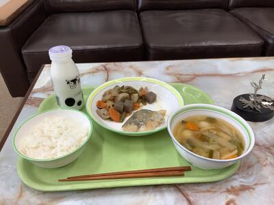 さわらの梅味噌がけ、筑前煮、和風汁、ご飯、牛乳です。