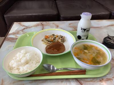ハンバーグデミグラスソース、きのこのソテー、レタスのスープ、ご飯、牛乳です。