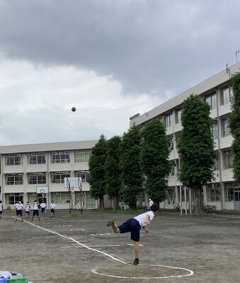 スポーツテスト、「投」の測定。見本になる素晴らしいフォームの男子の写真です。
