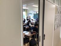 2年生の教室で定期考査最終日を落ち着いて迎えている様子を嬉しく思います。今日の3教科も取り組んできた成果を出し切ってくれるでしょう。