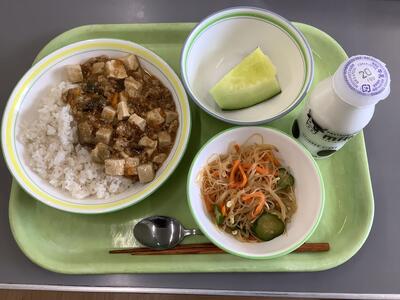 茄子入り麻婆豆腐丼(麦ご飯)、春雨サラダ、メロン、牛乳 です。
