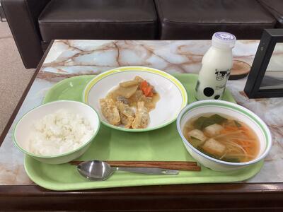 カレーうどん、鶏天、煮浸し、牛乳です。