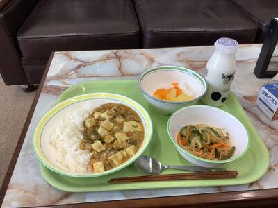 カレー麻婆豆腐丼、中華サラダ、フルーツ杏仁、牛乳です。