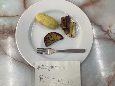 会議を終えて校長室に戻ると、最高のプレゼント。三種類のポテトにスイーツはどれも大変おいしい仕上がりでした。5組の皆さん、ごちそうさまでした。ありがとう。副校長先生と分け合いました。