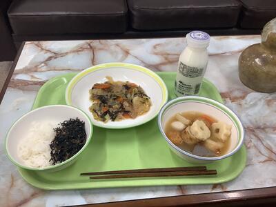 ご飯、かきたま汁、さわらの味噌マヨネーズ焼き、生揚げの炊いたん、牛乳 です。