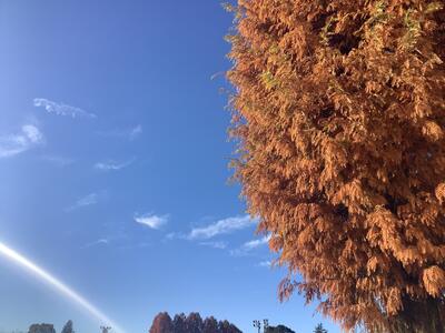 最高の空のブルーと本校のメタセコイヤの落葉前のブラウンのコントラスト。あいさつに夢中で生徒の登校の様子の写真を撮り損ねたので、朝の風景になりました。3年生中心に駆け込み登校が多く、廊下のダッシュがありました。怪我か心配です。朝の時間を余裕をもって過ごしてほしいです。