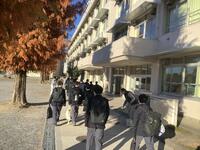 霜も下りる冷え込みですが、暖かな朝の日差しの中、最終日の登校をしています。
