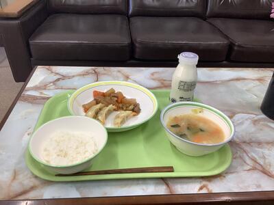 焼き餃子(1人3個)、豚肉と大根の中華煮、トックスープ、ご飯、牛乳です。