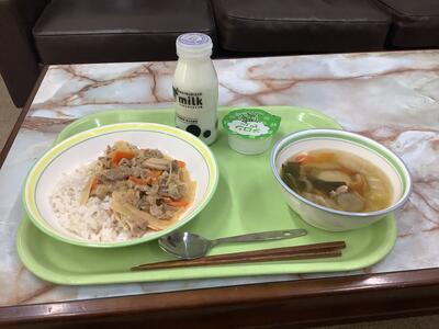 味噌豚丼、野菜の生姜汁、メロンゼリー、牛乳です。