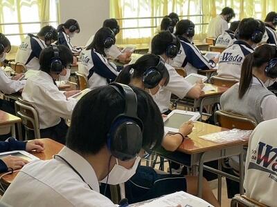 生徒一人一人がイヤーマフを耳に装着し、マイクからタブレット端末に解答音声を録音する形式で約20分間のテストを受けました。