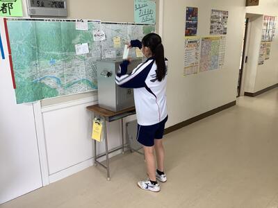 朝の登校時や昼食時の放送による選挙運動が終わり、この日は立会演説会及び投票が行われました。今回の生徒会役員選挙は、1、2年生の立候補者が多く、激戦となりました。立会演説会では、立候補者が和田中をより良くするための具体的な活動を発表し、応援演説者はなぜ推薦するのかを分かりやすく説明してくれました。また、投票では、3年生と5組が多摩市からお借りした本物の選挙投票箱を利用して、公正な選挙となりました。