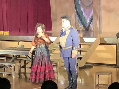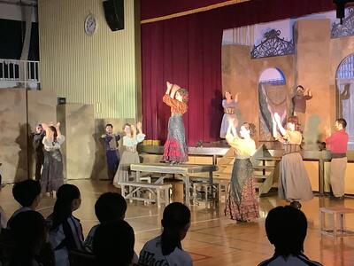 この日の体育館は、オペラアーツ振興財団により本格的な舞台装置ができあがり、照明や音楽がオペラ全体を盛り上げていました。そして、カルメン役をはじめ、それぞれの役者さんたちの歌声と演技には、とても迫力を感じました。今回は、オペラ鑑賞という貴重な体験ができ、いろいろな芸術や世界の文化について興味関心を高めることができました。オペラアーツ振興財団の皆様、ありがとうございました。