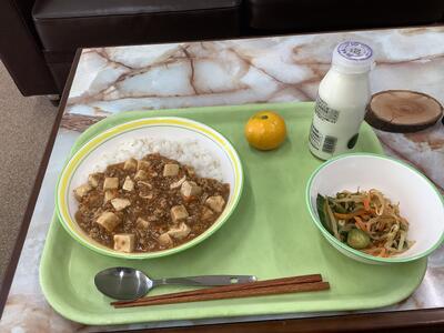 麻婆豆腐丼(麦ご飯)、中華サラダ、みかん、牛乳です。