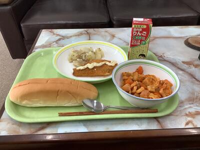 白身魚のフライ、ジャーマンポテト、トマト煮、コッペパン、リンゴジュースです。